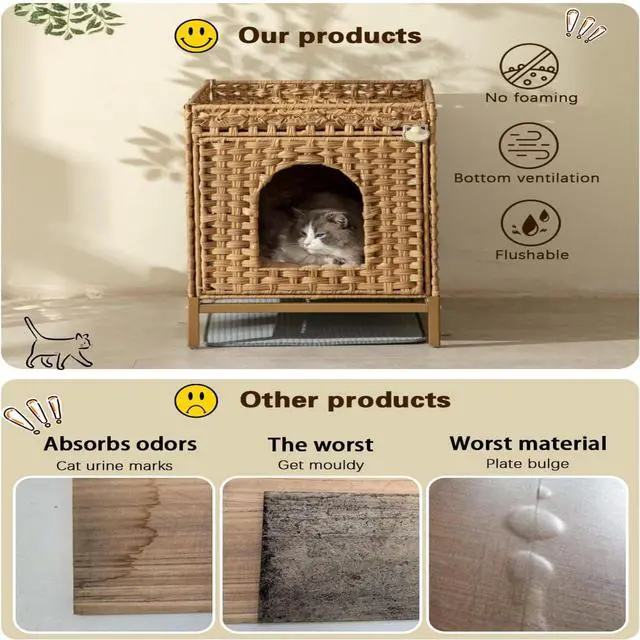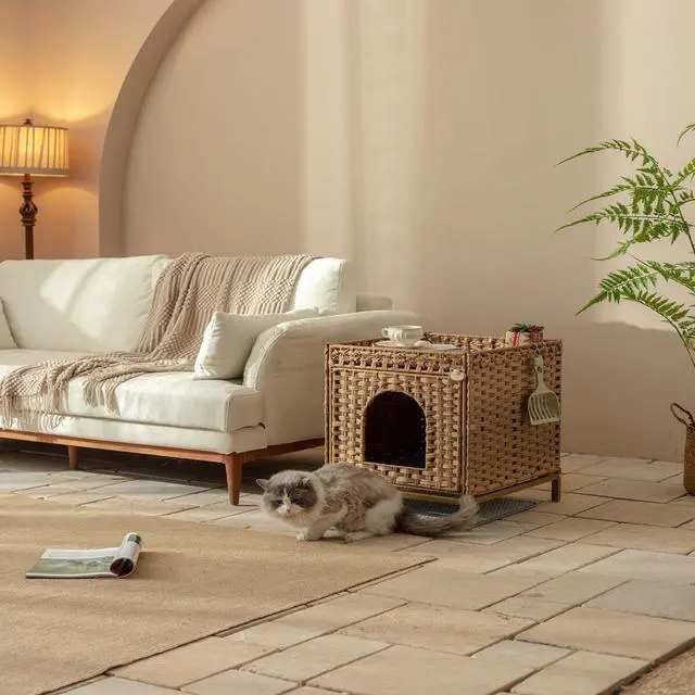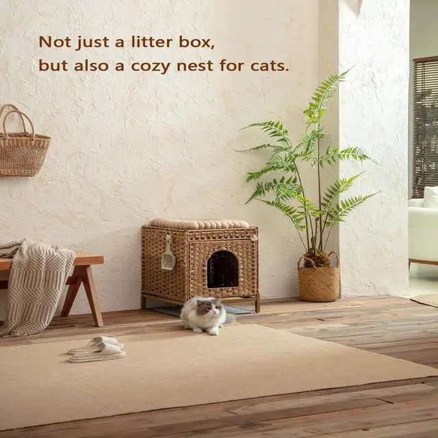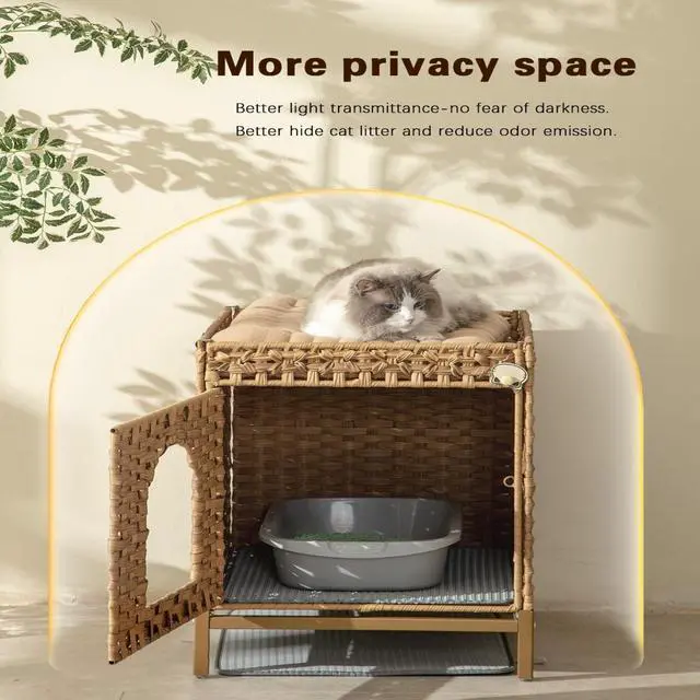 Upgrade your cats space with this modern PE rattan litter box enclosure, a waterproof, odor-controlling cat house that doubles as elegant furniture with ventilation and storage. Material: PE rattan + metal frame; Color: Grey, Brown; Size: 52×47×59cm (20.47"×18.5"×23.23"); Door: 24.8×19.7cm (9.8"×7.8"); Interior: 49.3×38.5cm (19.4"×15.16"); Fits litter boxes up to: 16.1"×19.2"×15"; Top weight capacity: 40 lbs; Use: Indoor litter box cover, cat bed, cat house, storage furniture.