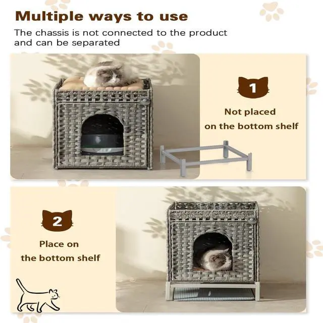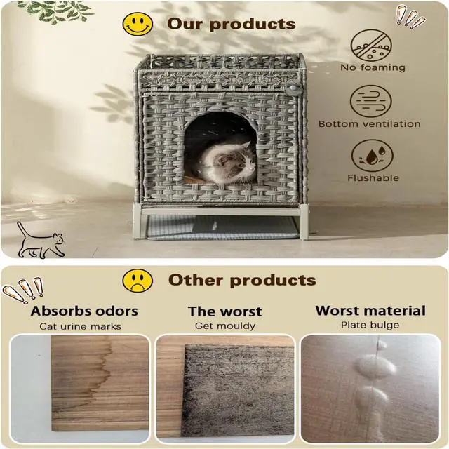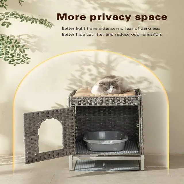 Upgrade your cats space with this modern PE rattan litter box enclosure, a waterproof, odor-controlling cat house that doubles as elegant furniture with ventilation and storage. Material: PE rattan + metal frame; Color: Grey, Brown; Size: 52×47×59cm (20.47"×18.5"×23.23"); Door: 24.8×19.7cm (9.8"×7.8"); Interior: 49.3×38.5cm (19.4"×15.16"); Fits litter boxes up to: 16.1"×19.2"×15"; Top weight capacity: 40 lbs; Use: Indoor litter box cover, cat bed, cat house, storage furniture.