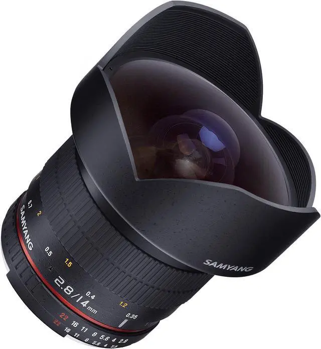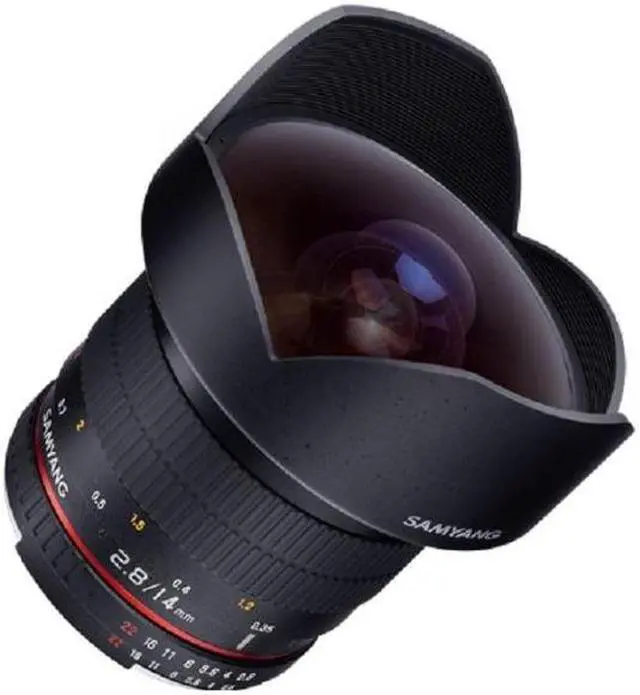 The Samyang 14 mm Ultra Wide-Angle f/2.8 IF ED UMC Lens for Sony E gives you approximately a 115-degree view with dramatic results when used with a full frame digital camera or 35 mm film camera. On APS-C sized sensors, the angle of view is between 90 degrees and 94 degrees depending on the brand. Four-thirds cameras produce a 76.24-degree angle of view.