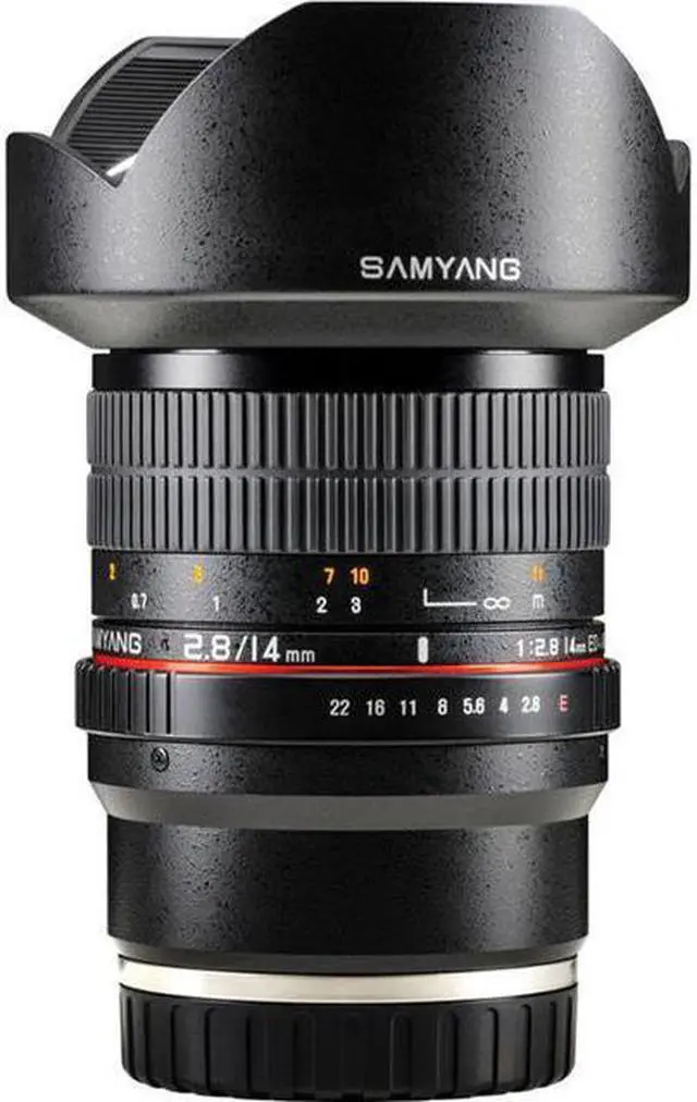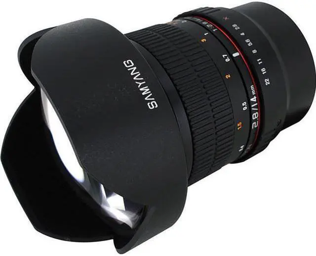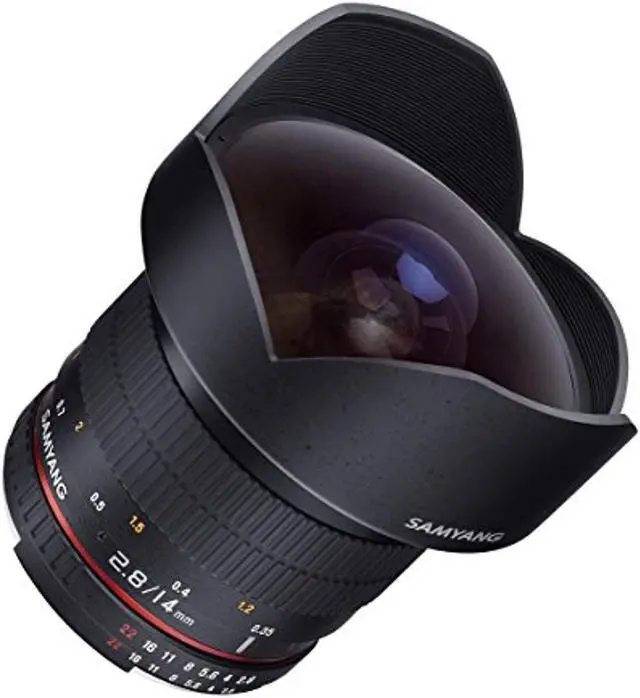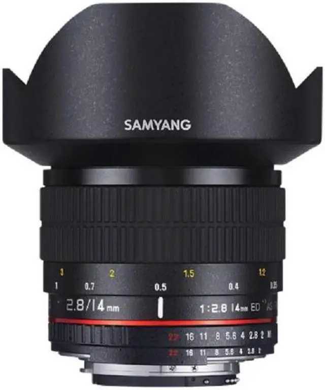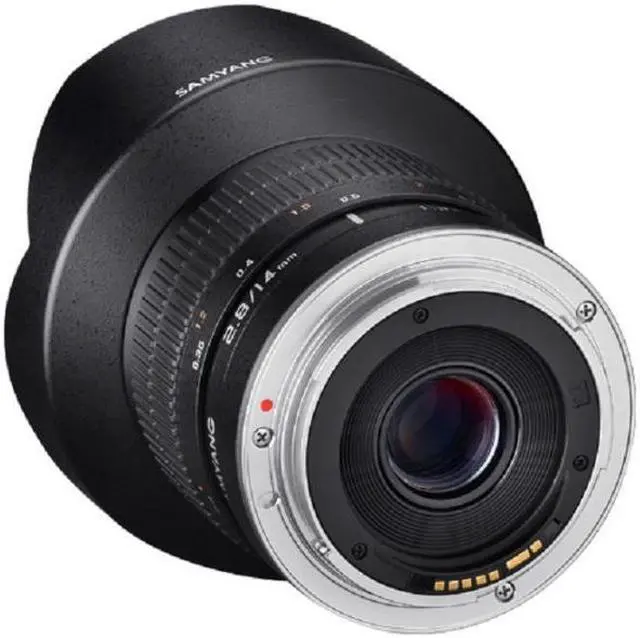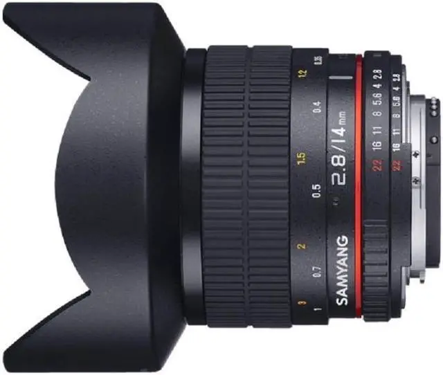 With hybrid aspherical lenses, you will produce sharply defined images with a minimum of distortion and chromatic aberrations. These manual focus 14 mm lens focuses as close as 0.9' (0.274 m) from the lens and has a built-in petal-type lens hood. With some cameras, Shutter Lock must be disengaged on the camera's menu.