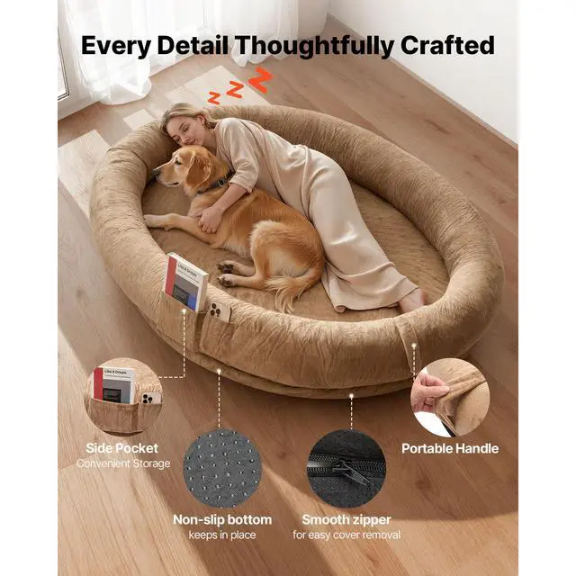 Human Dog Bed, 69.69 x 48.43 x 9.45 inch Orthopedic Memory Foam Human Sized Dog Bed, Humans Pet Beds with Side Pocket, Handle & Zipper, Removable Machine-Washable Dogs Beds for Humans, Brown
