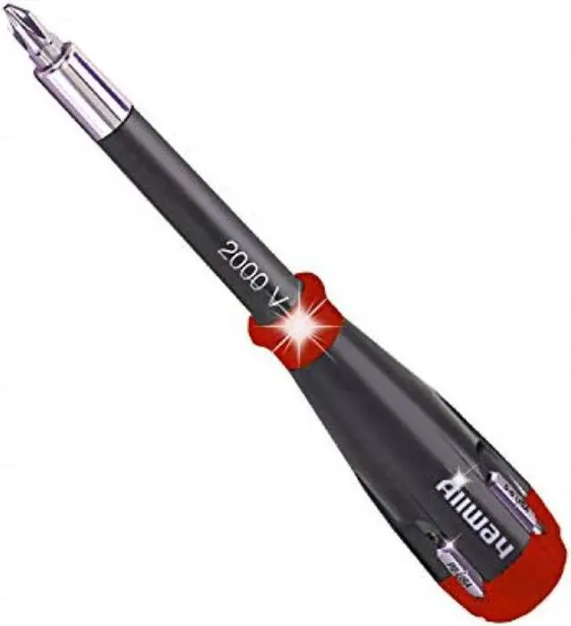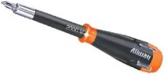 Four in one screwdriver with hi-torque fiberglass reinforced nylon construction; electronically safe; UL tested at 2000 volts; rare earth magnet retains both bits and screws. Includes (2) Phillips and (2) slotted standard power bits all retained in thehandle; counter display carton. null
