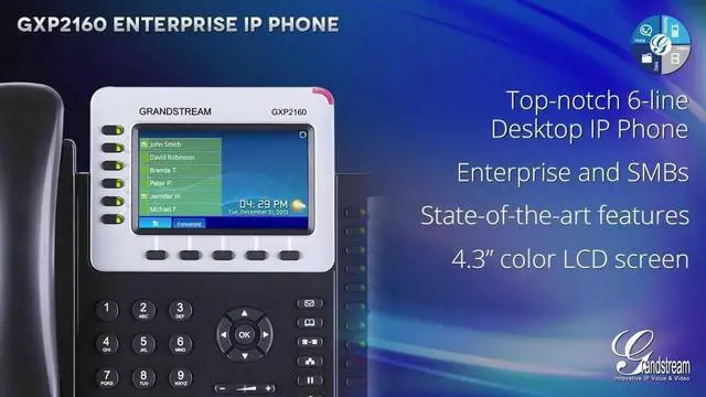 As all Grandstream IP phones do the GXP2160 features state-of-the-art security encryption technology (SRTP and TLS). The GXP2160 supports a variety of automated provisioning options including zero-configuration with Grandstream's UCM series IP PBXs encrypted XML files and TR-069 to make mass deployment extremely easy. Enjoy the internet to its max and get cost-effective voice communication to areas like lobbies guest rooms and conference hallsUses VoIP technology to transfer audio signals over the Internet while circumventing high toll charges by telephone companiesWith PoE port transfer data and power on a single cable to places where a power outlet is absent
