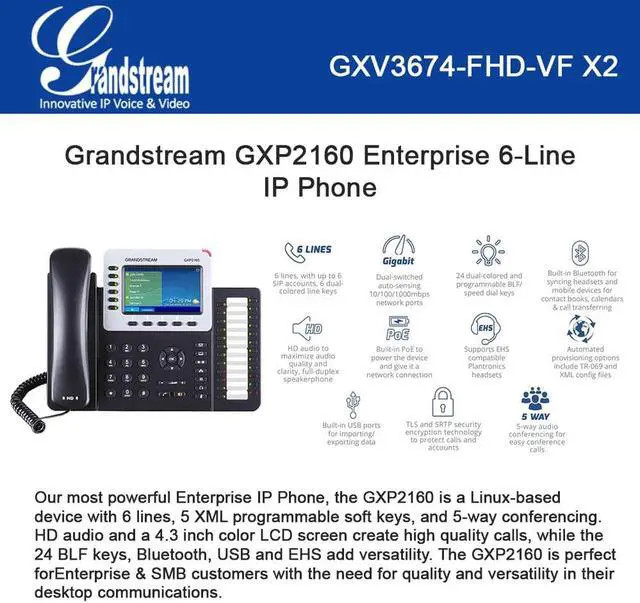 The GXP2160 is a Linux-based device with 6 lines 5 XML programmable soft keys for customization and 5-way voice conferencing to keep business users in-touch. HD audio and a 4.3" color LCD screen create high quality calls the built-on 24 BLF/speed-dial keys allow users to easily monitor presence and status of other extensions and transfer calls. Built-in Bluetooth support allows for use of Bluetooth headsets and transferring of phonebook and calls from paired mobile devices. This Enterprise IP phone also features Electronic Hook Switch support for Plantronics headsets and a built-in USB port. The GXP2160 is perfect for Enterprise & SMB customers with the need for quality and versatility in their desktop communications.