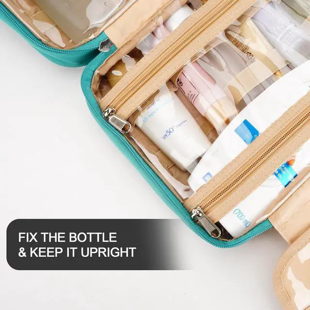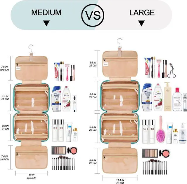 CONSIDERABLE DESIGN - The elastic bands inside the two main compartments can keep the different height bottles fixed and upright. Your comb, toothbrush, razor, and leak-prone makeup can all go in there, even a hair dryer. 360° metal hook gives you a variety of hanging options.