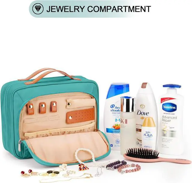 GREAT ORGANIZER MASTER - This wash bag is designed with 4 toiletry storage compartments and a special jewelry compartment, you can easily put your wash products and jewelry separately to make your journey organized. The size of the fully-loaded state is 11''L x 8.5 ''H x 4.5 ''W, Allows you to carry the toiletries for at least a week.