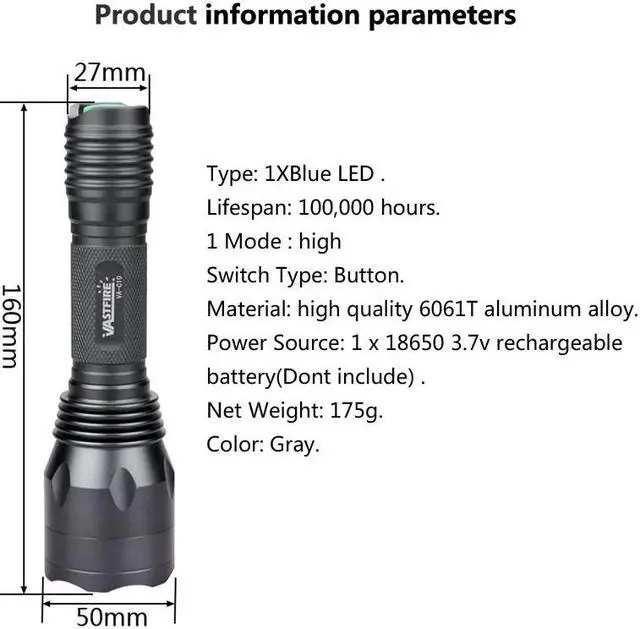 Power Source: 1 x 18650 3.7v rechargeable battery(Dont include) .