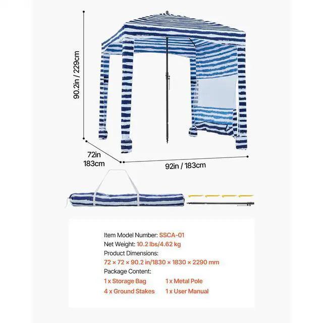 Package Content 1 x Beach Cabana 1 x Storage Bag 1 x Metal Pole 4 x Ground Stakes 1 x User Manual