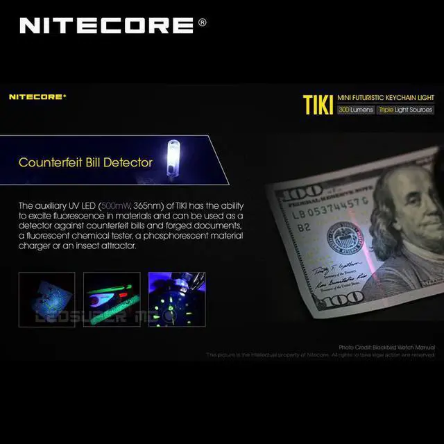 Counterfeit Bill Detector: The auxiliary UV LED (500mW, 365nm) of TIKI has the ability to excite fluorescence in materials and can be used as a detector against counterfeit bills and forged documents, a fluorescent chemical tester, a phosphorescent material charger or an insect attractor.
