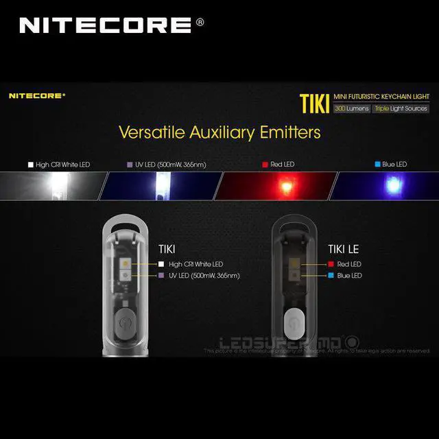 The TIKI is equipped with auxiliary UV light and the high CRI white light while the TIKI LE has blue and red lights.