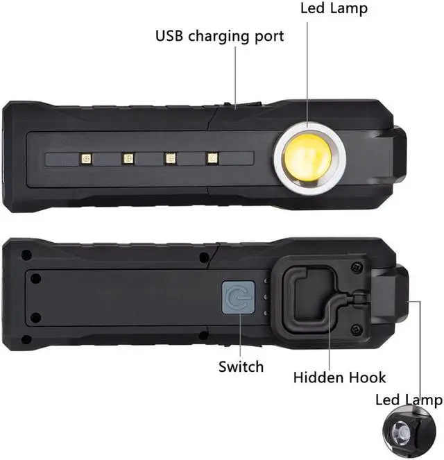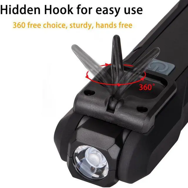 Charactristics: power display, with hook, magnet at the bottom, 180 ° folding plastic encapsulation process at the bottom, shock-proof, anti-fall; retains the lighting function of the product itself and the maintenance and inspection function of the work lamp. The UVC sterilization lamp is added to make the working environment more Safe and secure; yellow light has the characteristics of strong penetrating light and softness.