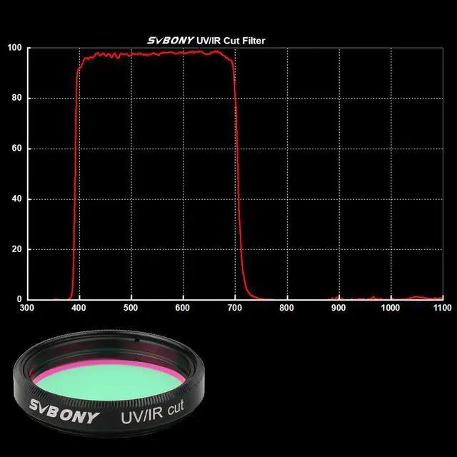 UV-IR Cut FilterThe filter is a must for all digital imaging with Digital Cameras, CCD Cameras, and modified Webcams. The UV-IR-Cut filter uses the very latest coating technology, to deliver the finest filtration quality - and lifetime durability. If you use DSLR camera, CCD camera, or telescope, it absolutely will be one of your the best choices.