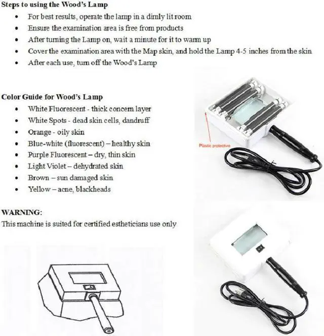 Wood is to help identify clearly the qualities, problems and the unusual conditions of the skin, in order to provide proper treatments, examine different skin, types or skin particles and conditions, detects imperfections in the skin normally invisible to the eye. Allows esthetician to conduct treatment plan for proper face.