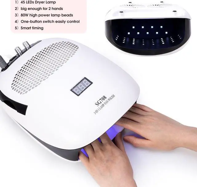 Led Nail Lamp:This product uses double-core 365+405nmnm LED lamp beads, which can quickly cure all kinds of nail gel polish: LED gel, UV gel, Builder gel, Sculpture gel etc; 45 pcs strategically placed LEDs,no dead-zone,more free.
