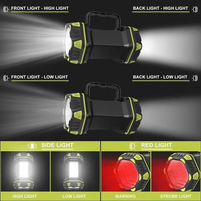 4+4 Lights ModesThis camping flashlight has front, back lamp heads and side lights, including red warning and strobe lights, and a total of 8 lighting modes. The two-button rubber switch can satisfy the needs of turning on two modes at the same time.