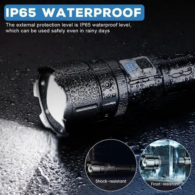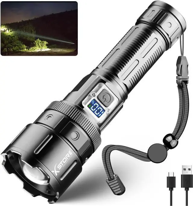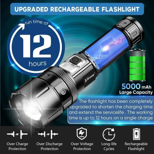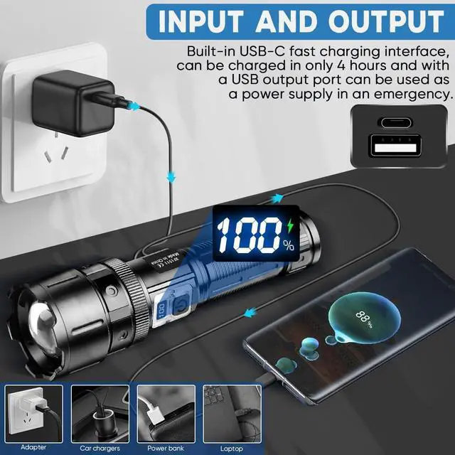LCD Powerful Flashlights & Rechargeable FlashlightsThis high powered flashlight has undergone a new upgrade and is equipped with a LCD power percentage display, Easily grasp the remaining power. In addition, This rechargeable flashlights high lumens is equipped with two charging ports, USB and Type-C. Which can be used as a power bank in emergency situations. Rechargeable batteries can charge and discharge more than 50000 times. The rechargeable battery has passed strict UL testing to ensure safety.