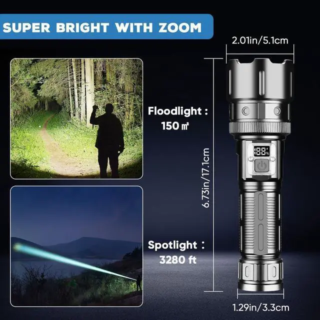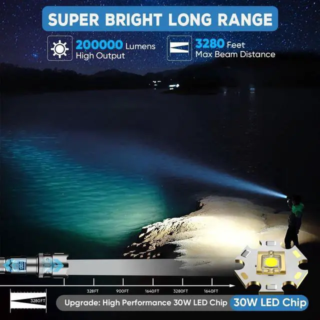 Super Bright Flashlight & Powerful Flashlight This powerful LED flashlight equipped with a super bright 30W white LED chip, can achieve a high lumen output of 200, 000, which is 10 times brighter than a regular flashlight. It can easily illuminate the entire room and backyard, or focus on objects 3280 feet away. It is very suitable for home backup, hiking, camping, fishing, dark hiking, power outage emergencies, or other indoor and outdoor activities.