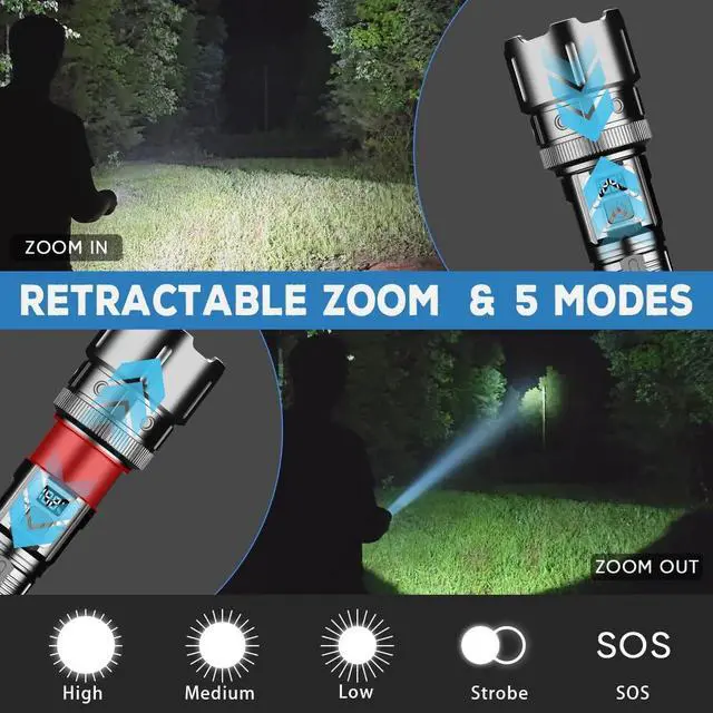 Adjustable Focus & 5 Modes: This handheld flashlight has 5 lighting modes: high medium low frequency flashing SOS. You can press and hold the button for 3 seconds in any mode to turn off the rechargeable flashlight. According to your needs, you can stretch the head of the flashlight to adjust the focus, freely choose the spotlight for remote viewing and the floodlight for large-scale lighting. It is very suitable for camping, hiking, mountaineering, running, night walks, emergency situations, or general household use.