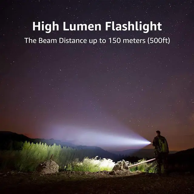 SUPER BRIGHT & LONG-LASTING - Equipped by LED, the beam distance of flashlight is up to 492ft. Luminous flux is about 140 lumen in full brightness. Easily light up an entire room.