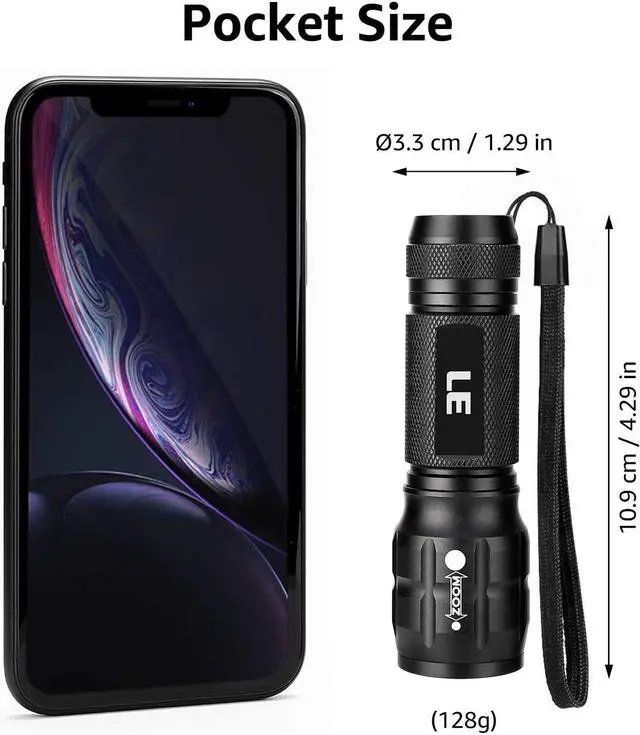PORTABLE SMALL SIZE - Our LED flashlight is portable small size, Length: 4.2 in, Diameter: 1.2; Weight 128g, fits well in your hand or pocket. Compact to fit easily into your pocket wherever you go.