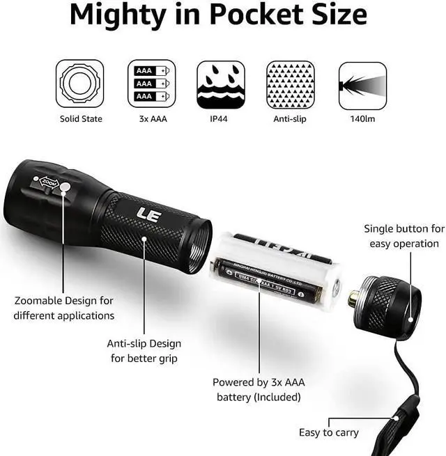 ZOOMABLE FLASHLIGHT- Led flashlight has ability to narrow or widen the area you wish to light. You can stretch the head-pulling zoom to adjust its focus and get spot beam or flood beam you need.