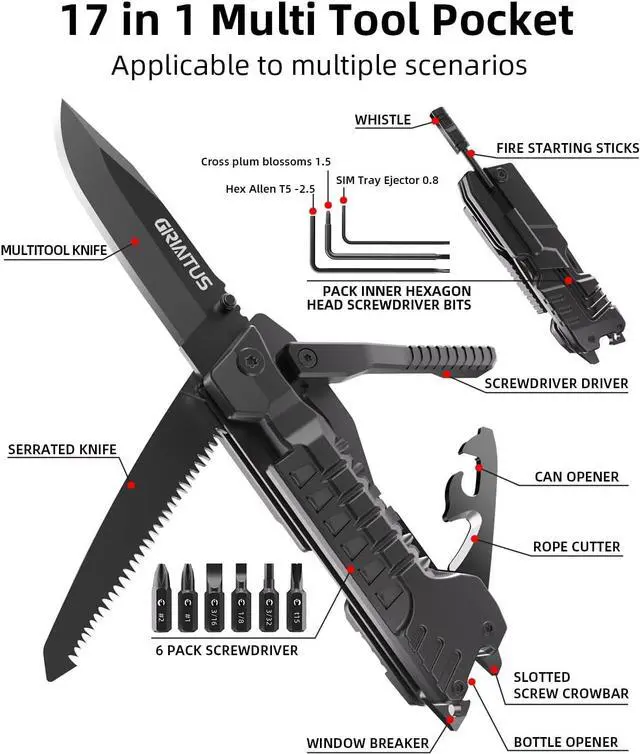 Multi-tool, Lightweight and Portable 17 different pocket tools can meet various tool needs, meet the varied needs of survival, such as cutting, screwing, safety broken windows, sawing wood, making a fire, easy to open bottles and cans, etc. The multi tool knifes compact and lightweight design fits into a pocket wear it on their belts.