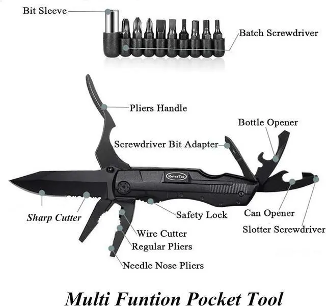 Pocket Multitool Knife: Features 3.15 '' Knife, Pliers, Wire Cutter, Bottle & Can Opener, 9-Pack Screwdrivers and it comes with a nylon pouch