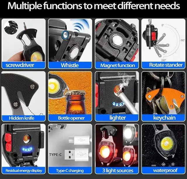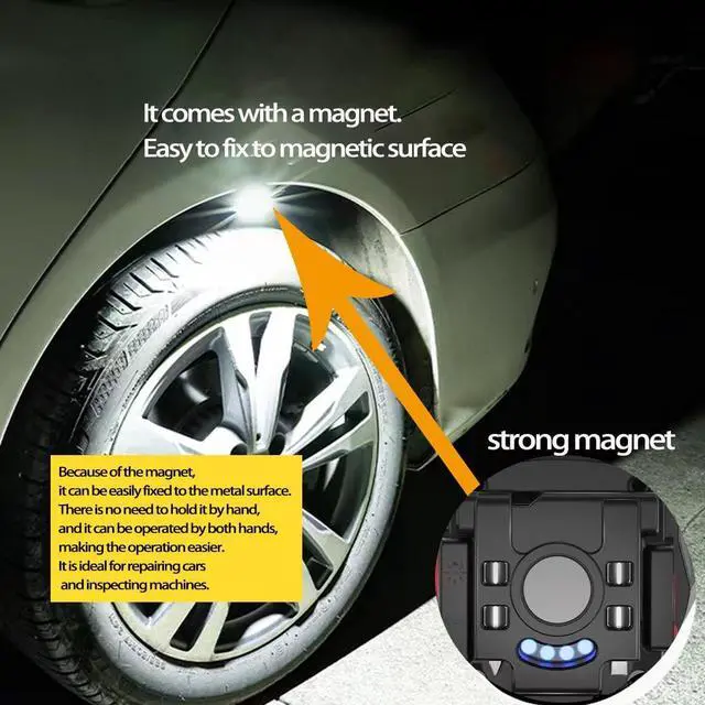 Magnetic COB Work Light- The cob work light has a strong magnetic attraction on the back, which can be easily attached to any metal surface. 180-degree adjustable stand allows you to place the cob light at different angles according to actual needs. The carabiner design allows you to hang the cob light. Help you free your hands and make your work more convenient.
