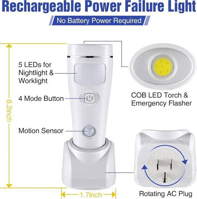 Rechargeable Power Failure Light: rechargeable LED light is always ready to use with a convenient plug in design that works in standard outlets;