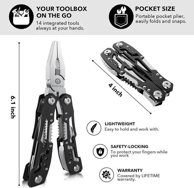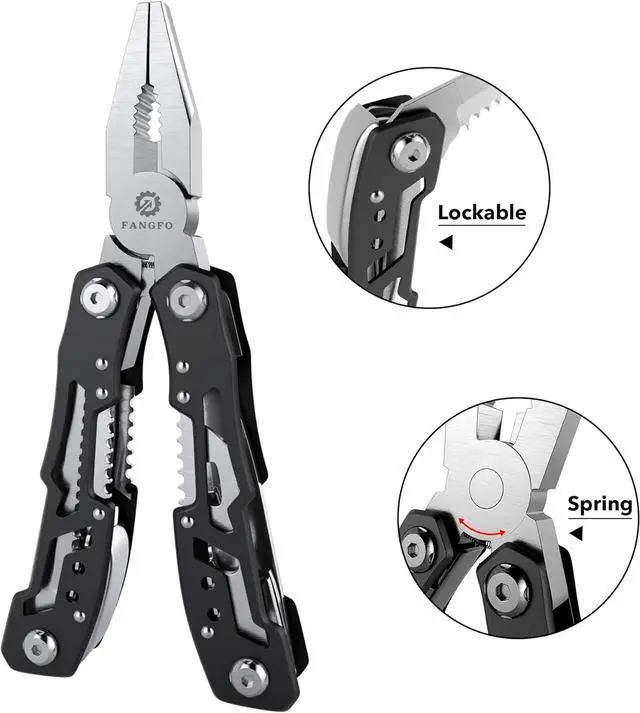 Safety Locking: fangfo Multitool With side lock design, every tool and knife ( except the pliers heads ) will be locked when fully open.