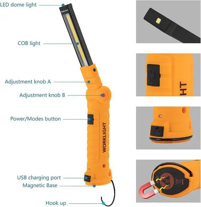 Rechargeable magnetic work light: This COB LED worklight built-in rechargeable battery, rechargeable by USB port, can be use as cordless work light. The magnet base makes it very suitable as underhood led work light and mechanic work light.