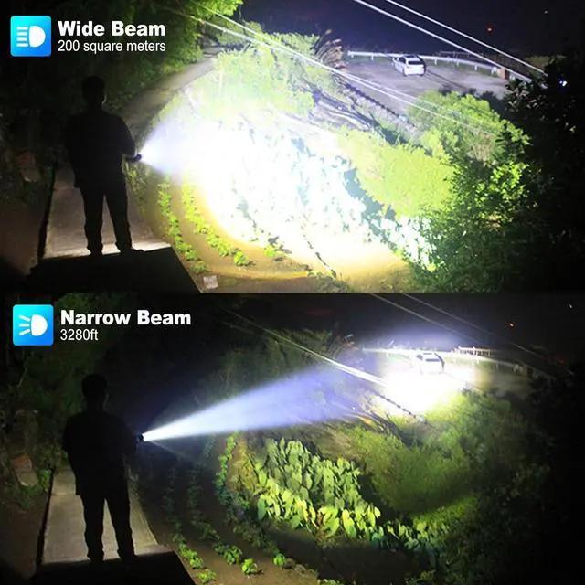 Adjustable FunctionThis powerful flashlights can switching between in wide beam and narrow beam by pulling and pushing the head. The wide beam Lighting, provide you with bright and wide vision when you walk at night, dispel the darkness and provide you with a full sense of security. the narrow beam lighting for long-range observation, max beam range to 3280ft, accurately help you detect the field of vision, allows you to see objects in the distance more clearly.