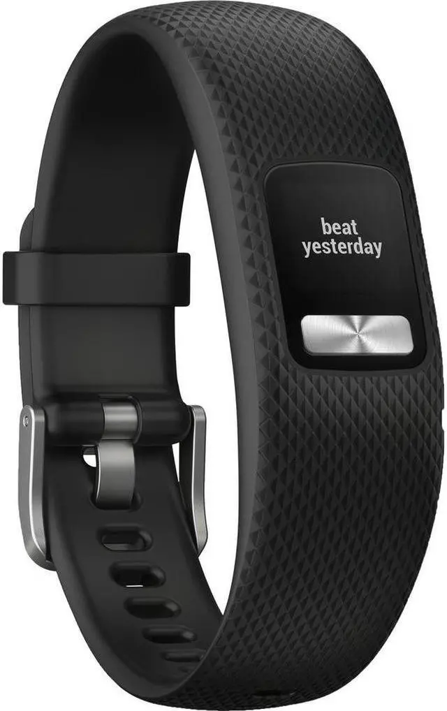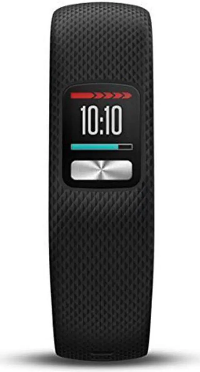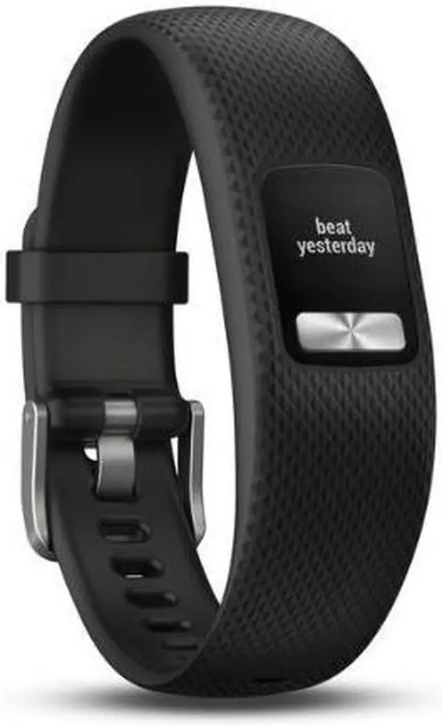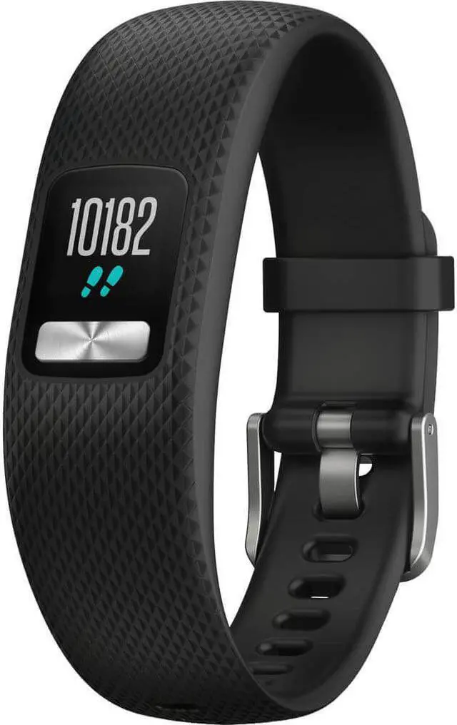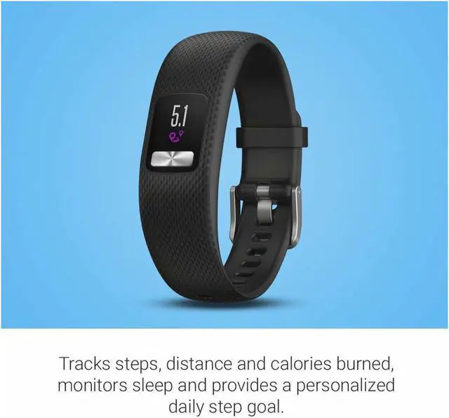 The Garmin VivoFit 4 is a fitness band that learns your activity level and assigns a personalized daily goal. It gets paired with heart rate monitor for fitness activities and displays steps, calories, distance and monitors sleep. The VivoFit 4 follows your progress 24/7 and it can stay on for more than a year without a battery change. It shows steps, calories, distance, intensity minutes and time of day on backlit display.