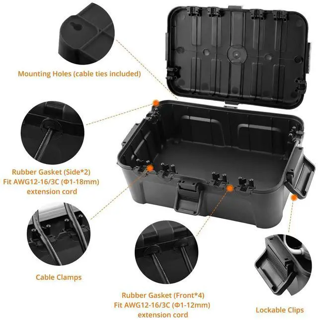 Wide Compatibility: Never worry about your outdoor connections again! This protective box delivers total security against the elements. Its combination of 4 locking clips, a full lid, and sealing rubber gaskets ensures an waterproof seal for various cords, including 12/14/16 gauge, braided, and flat types.