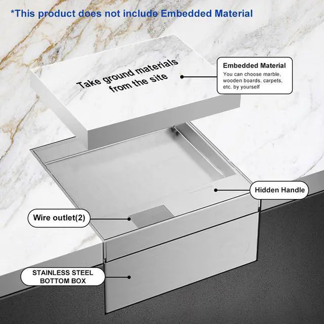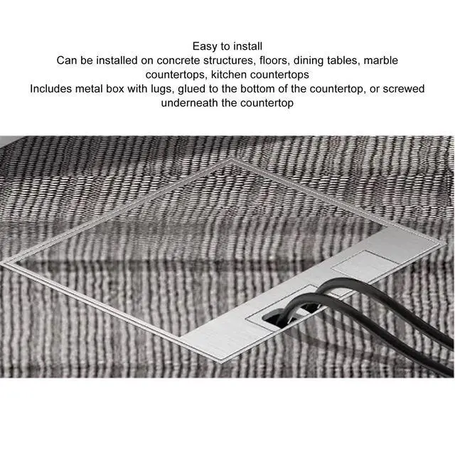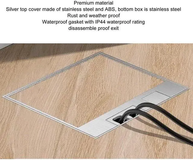 Feature:1. PREMIUM MATERIALS: Silver top cover is made of stainless steel and ABS, the bottom box is made of stainless steel, rustproof, weather proof, waterproof gasket with IP44 waterproof rating, disassemble proof outlet.2. EASY TO INSTALL: Can be installed on concrete structures, floors, dining tables, marble countertops, kitchen countertops. Includes metal box with ears, glued to the bottom of the countertop or screwed underneath the countertop.3. MULTIPLE FLOOR TYPES: Professional recessed flat hidden socket kit can be used on multiple floor types, tile, stone, wood, laminate and carpet.4. EASY TO USE: Unfolded when in use, hidden in the box when not in use, open to plug the product into an outlet to charge when needed, hidden on the floor or countertop when not in use.5. UNIQUE DESIGN, COMPLETE KIT: Stylish, low key metal cover sinks into the floor when not in use. Kit includes base x1, cover x1, accessories x1, screws x8, socket x1.Specification:Item Type: Recessed Flat Hidden Socket KitMaterial: Stainless Steel, ABSWeight: Approx. 1181g/41.7ozBottom Size: Approx. 130x130mm / 5.12x5.12in Use: Hidden Waterproof American Floor SocketSpecification: US Plug 100-265VPackage List:1 x Base 1 x Cover1 x Accessories8 x Screws 1 x SocketNote:Manual measurement please allow some error.