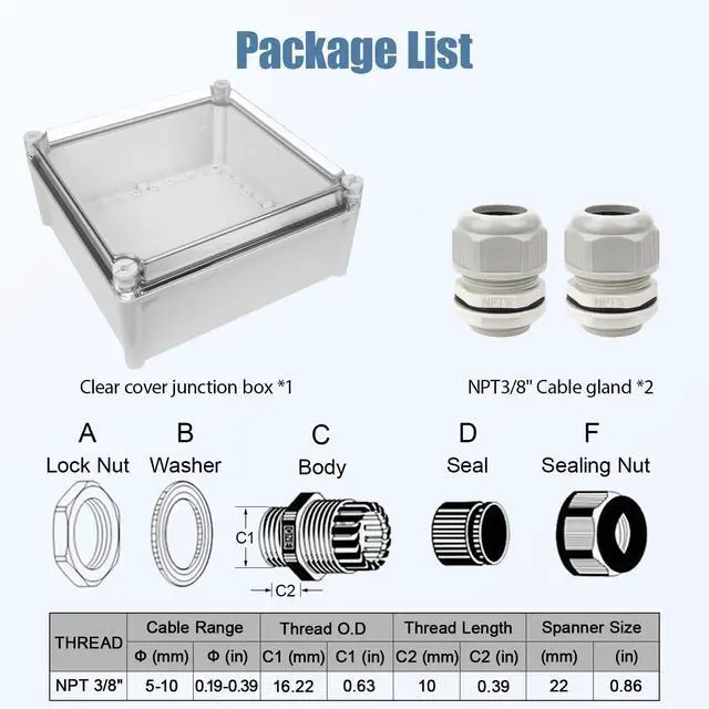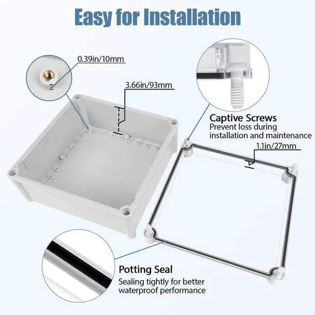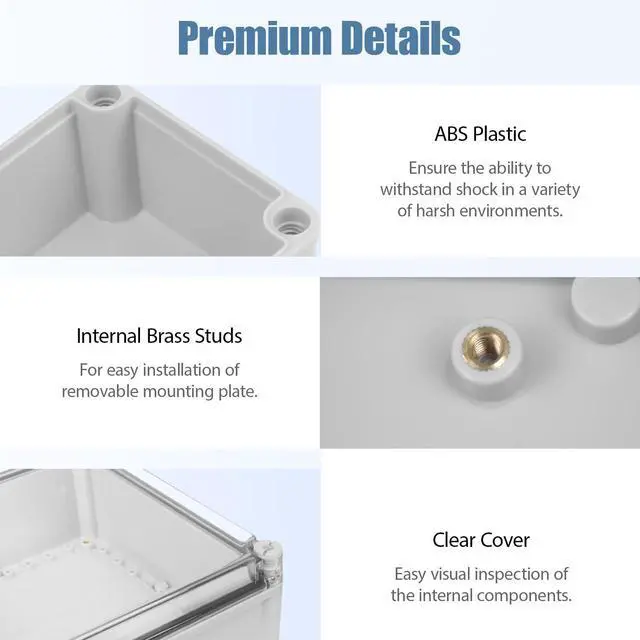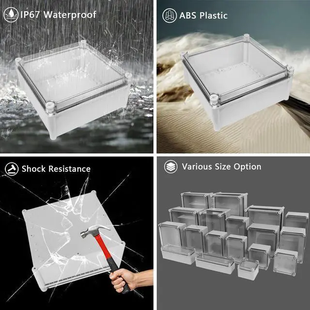 ![]() Clear lid electrical box | ![]() Grey lid electrical box | ![]() Hinged clear cover box | ![]() Hinged grey cover box | ![]() Stainless steel latch box | ![]() White junction box | ![]() Reserved hole box |