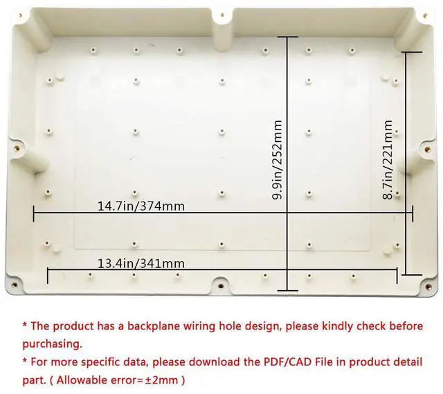 Inner Size: 14.7"x9.9"x3.9"(374mmx252mmx99mm)/(L*W*H)- - * Tips: in order to confirm the detailed installation dimensions, please refer to our detail image, which shows specific internal dimensions of the product.(Allowable Error: 2mm)