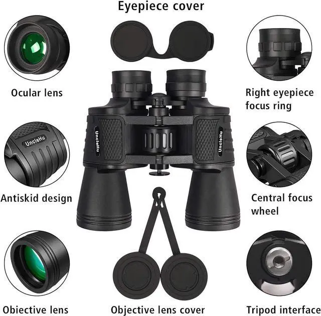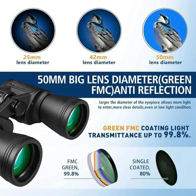 Powerful Binoculars - 26mm Large Lens26mm eye lens diameter and 50mm objective lens diameter, large field of view. 26mm eye lens collect more lights than others (e. g. 10x25, 12x25, 10x21 binoculars and ordinary 10x42, 12x42 binoculars), delivering clearer and brighter view. Perfect binoculars for adults bird watching, hunting, camping, hiking, sports and stargazing.