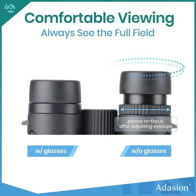 Comfortable Experience: Twist the eyecups up and down to see the world with or without glasses - eye relief range 13.6 mm - 19.6 mm. Adjust the center focus wheel to easily fit your eyes, and the diopter (located on the right eyepiece) balances left and right eye parallax
