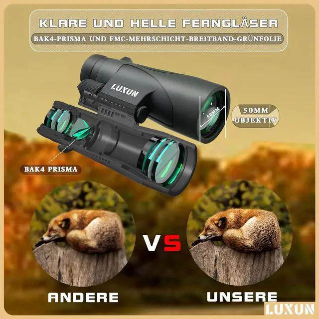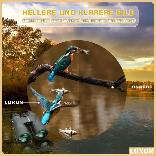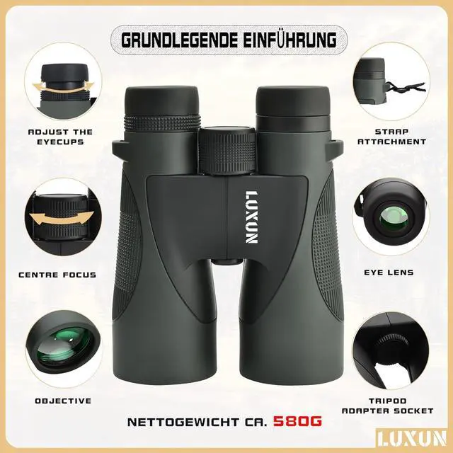 12x50 binoculars. 20mm large eyepieces with 12x HD magnification can capture details of the observed object at 273ft/1000yds. LUXUN 12x50 binoculars combine the advantages of image clarity and compact size. The 50mm large aperture objective lenses present a brighter and clearer field of view, making you feel as if you are in the world as you observe it.