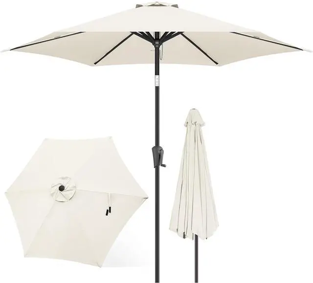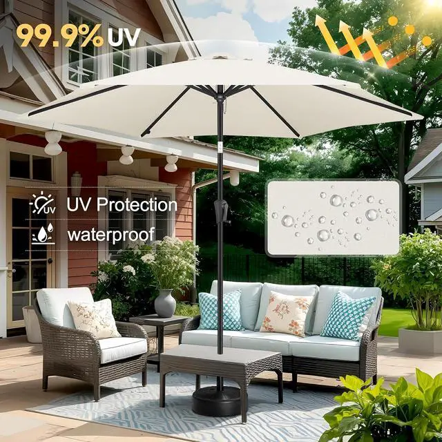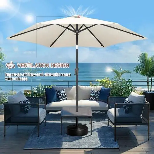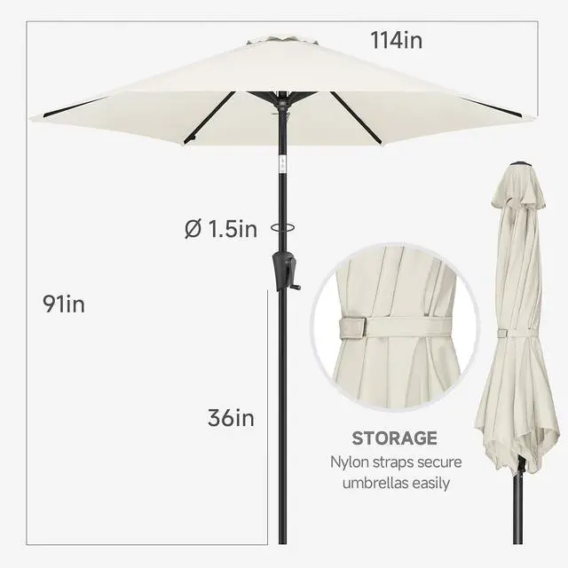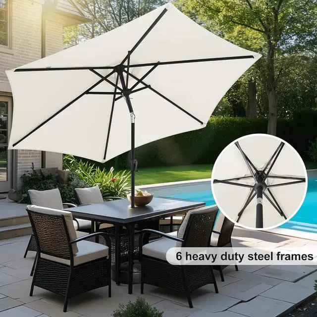 Enjoy your outdoor space in comfort with this 9.5 ft Patio Umbrella. Featuring a sturdy steel frame with six heavy-duty alloy ribs for excellent wind resistance, this umbrella provides a generous 114-inch diameter of shade, suitable for 47-59 inch tables. Crafted from high-density waterproof fabric with 99.9 % UV protection, it effectively shields you from the sun and rain, making it ideal for patios, balconies, and gardens. The easy-to-use crank winder allows for effortless opening and closing, while the tilt function lets you adjust the shade as needed. A top vented canopy design promotes air circulation, keeping you cool.