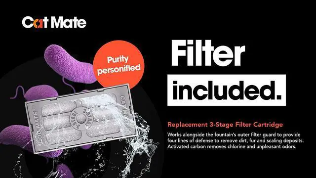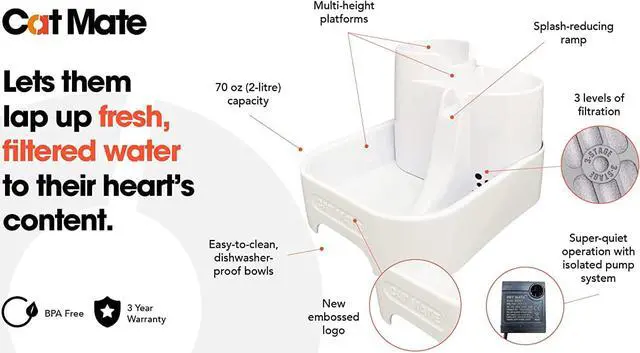 Multi-Height drinking stations Ramp reduces water splashing I. P. S. (Isolated Pump System) for super-quiet operation Polymer-carbon filter for water purification (replacement cartridges available 3 Year Guarantee