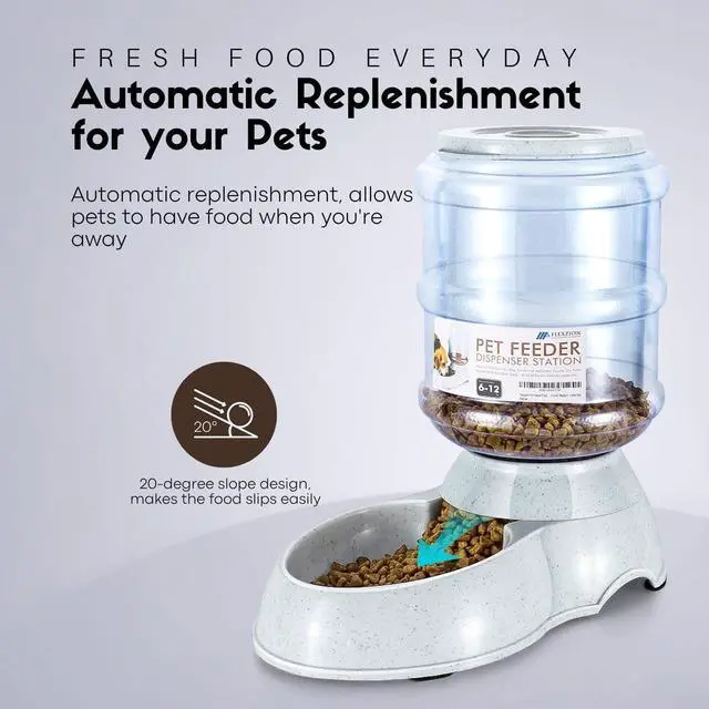 Automatic pet feeder system with gravity feed design that replenish your pet's food supply when it reaches low