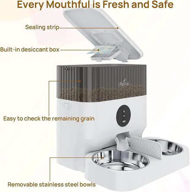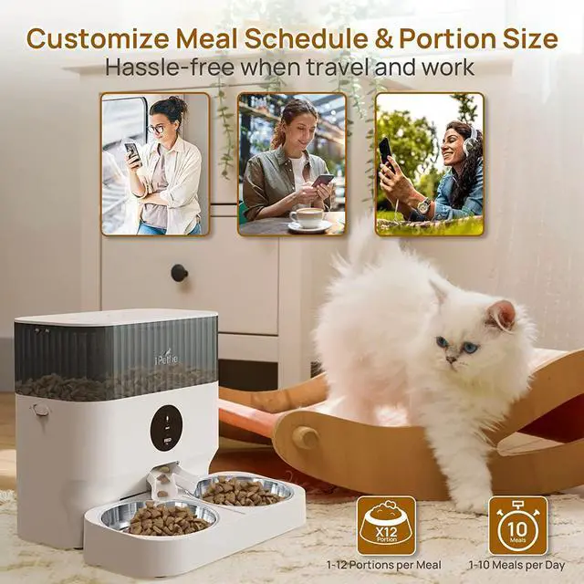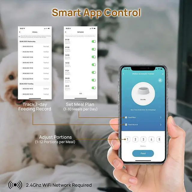 App Control: Feed your pets anytime and anywhere by using the smart control app. Set 1-10 meals per day with 1-12 portions per meal. Track feeding records and share the device with multiple accounts. Support 2.4GH z network only.