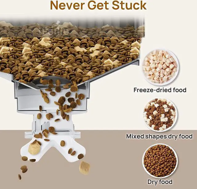 Never Get Stuck: Equipped with a large torque motor, this automatic feeder eliminates the problem of food jams and missed feedings. Only use dry kibbles or freeze-dried food between 0.12 - 0.51 (3mm-13mm) in size for best results.