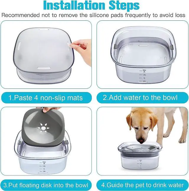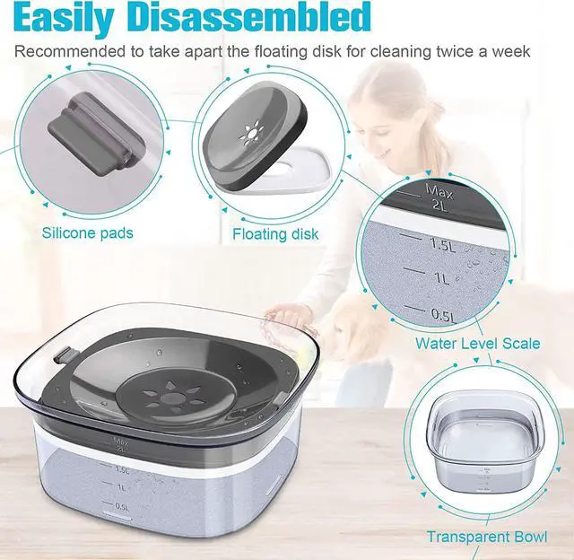 Anti Spill & Non-Slip: Widened bowl mouth, floating disk, and silicone plugs combine to effectively prevent water from spilling out and keep the floor clean. The non-slip frosted bowl bottom helps prevent the floor from scratching.
