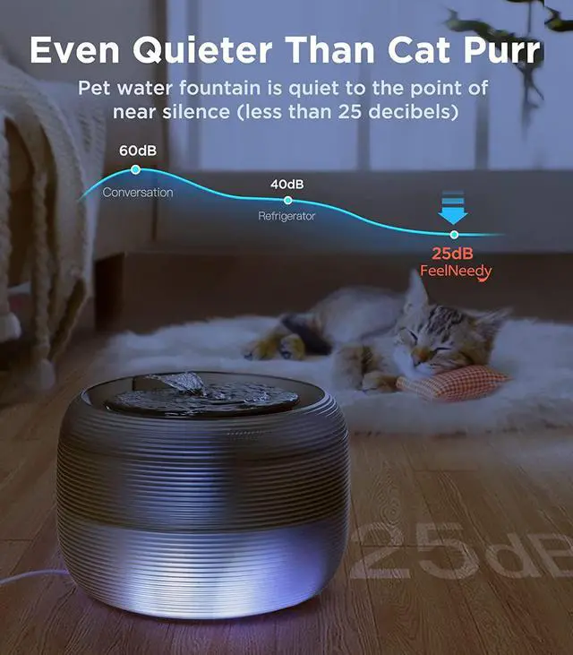 [Super Quiet Trickle] With a sound-absorbing spong and a ultra-quiet pump, FeelNeedy cat water fountain is quiet to the point of near silence with a sound level as low as 25 decibels. You and your beloved kittens can have a good night's sleep at night.