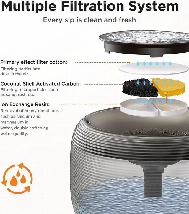 [Dynamic Fresh Water Fountain] The free-falling stream acts as a mini waterfall to encourage your four-legged friends to drink more. 4 layers of filter system (primary hair stopper, high-density cotton, Ion exchange resin, coconut shell activated carbon) allowing only water molecules, beneficial minerals and trace elements to pass through.