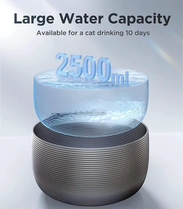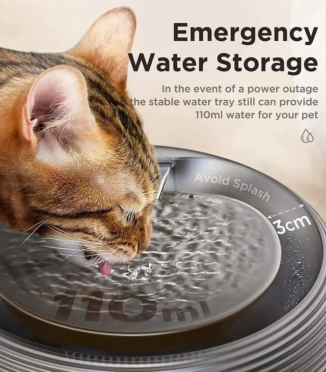 [ 2.5L Water Capacity & 110ml Water Tray] A single cat's average drinking varies from 40ml-60ml per kilogram a day. Water can be added once and last for more than 10 days. In the event of a power outage, the stable water tray still can provide 110ml water for your pet.