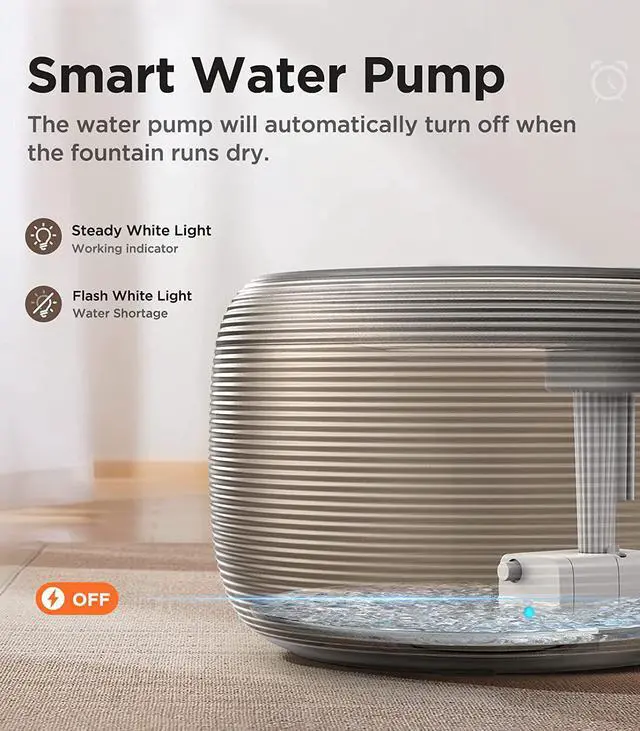 [Visible Water Level & Water Shortage Protection] Featuring a semi-transparent modern basin and a bright LED light, you can monitor the water level at a glance. The LED light will be flashing when water level is low. The pet fountain includes a sensor that would automatically turn off the pump when the fountain runs dry, which extends device lifespan.